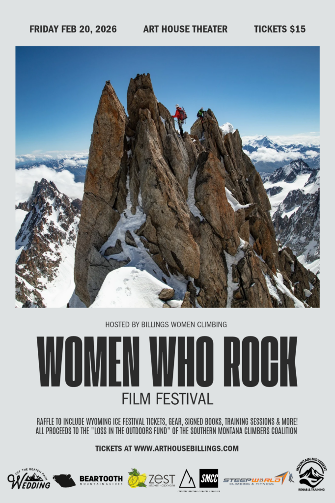 Sponsored by Billings Women Climbing; Beartooth Mountain Guides; Off the Beaten Path Wedding; Mountain Movement Rehab & Training; Steepworld Climbing & Fitness; and Zest Kitchen & Cookware.